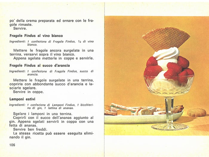 In questi anni crebbe fortemente il tenore di vita degli italiani e il simbolo di questa trasformazione fu senz’altro la diffusione degli elettrodomestici nelle abitazioni. L’avvento del frigorifero nelle case degli italiani, in particolare, ebbe un impatto immediato sulle abitudini e i consumi alimentari. Questo cambiamento coinvolse ben presto anche gli alimenti surgelati, cui gli italiani cominciarono a guardare con interesse e curiosità. Il fenomeno prese le mosse dai grandi centri urbani, con i primissimi supermercati forniti di banchi frigo. L’acquisto restava legato al momento del consumo, poiché la possibilità di conservare i surgelati nella propria abitazione sarebbe arrivata soltanto alla fine degli anni Sessanta, con la comparsa dei primi modelli dotati del comparto “freezer” a –18 °C.