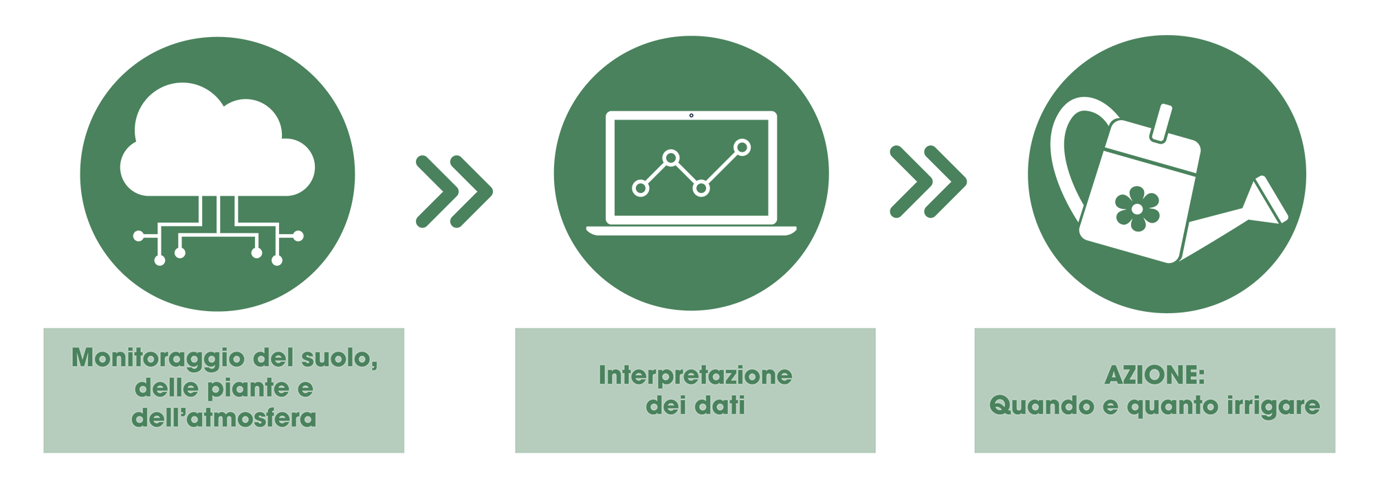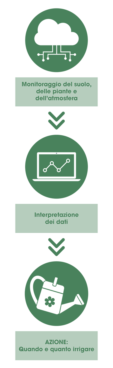 Questo tipo di irrigazione intelligente permette alle colture il giusto quantitativo di acqua, quando ne hanno realmente bisogno. Senza sprechi e valutando giorno per giorno il fabbisogno delle piante.