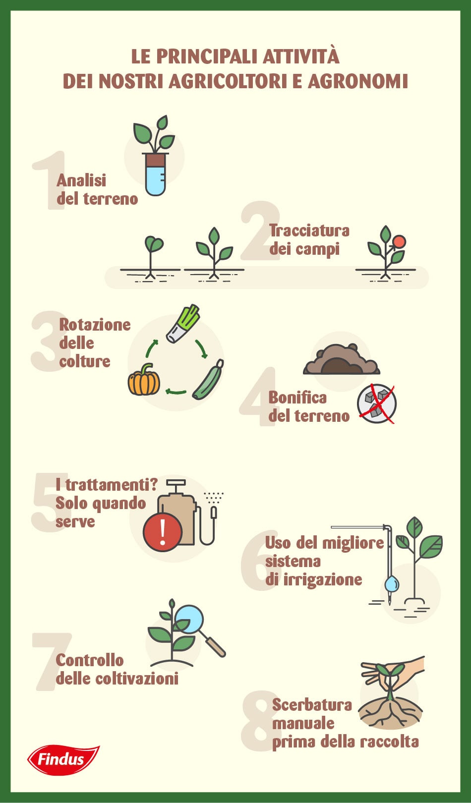 - Il controllo delle colture. Gli agronomi Findus, prima di effettuare la raccolta, controllano lo stato di maturazione delle colture, che per essere raccolte devono possedere le migliori caratteristiche nutrizionali. Inoltre , campionando il raccolto, effettuano tramite una serie di analisi di laboratorio, i controlli necessari a garantire la sicurezza e la qualità dei prodotti..