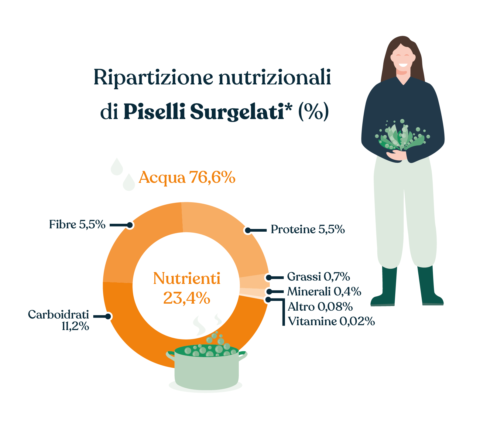 Sono ricchi di proteine e fonti di vitamine (soprattutto A ed E, ma anche B1, B2, B9 – il preziosissimo acido folico – C e K). Contengono diversi sali minerali (potassio, ferro, fosforo, calcio, magnesio, zolfo, sodio e zinco) e pochi grassi. Sono ricchi anche di fibre solubili, amidi e zuccheri. Per tutte queste ragioni, i piselli sono un alimento ideale per il nostro corpo.
