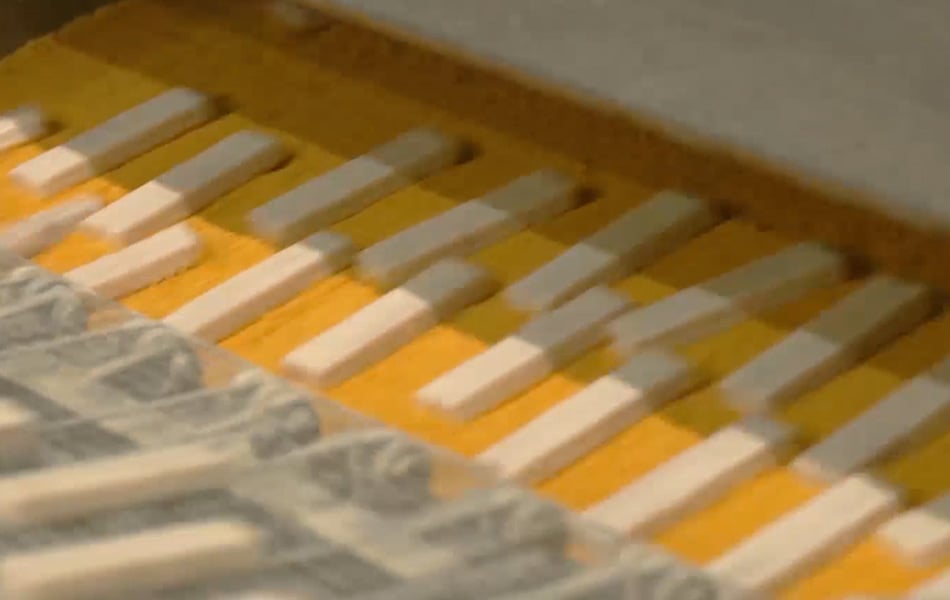 Qui il blocco di filetti viene diviso in porzioni, ovvero tanti piccoli bastoncini di pesce.